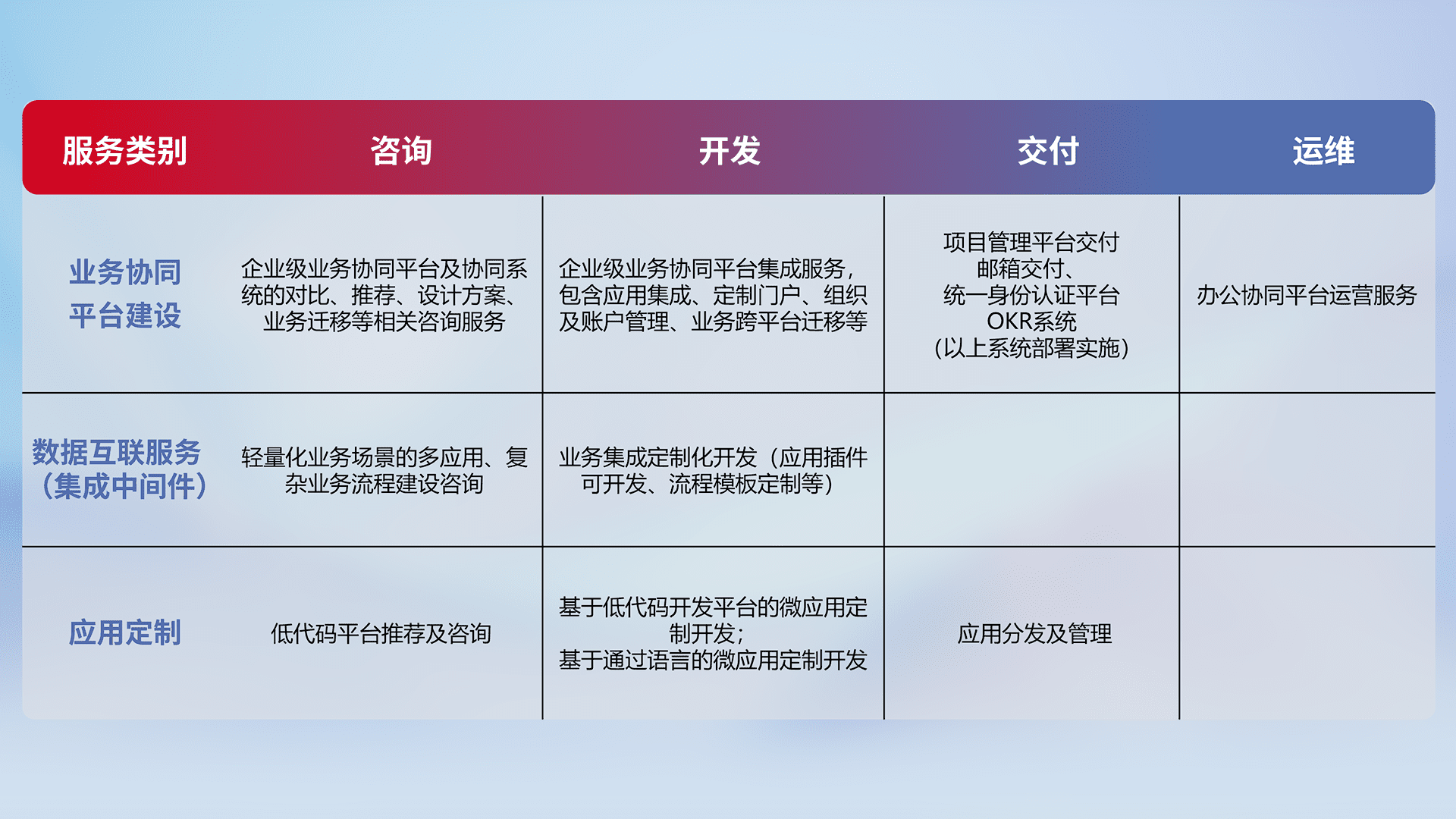 针对钉钉、、、、企微、、、、IDaas等平台级产品提供产品的规划、、、、方案、、、交付、、、、定制化开发等服务,,实现如统一协同办公、、智能客户服务、、混合会议管理、、智能数据查询、、、、等业务场景,,,实现数字化转型。。。。